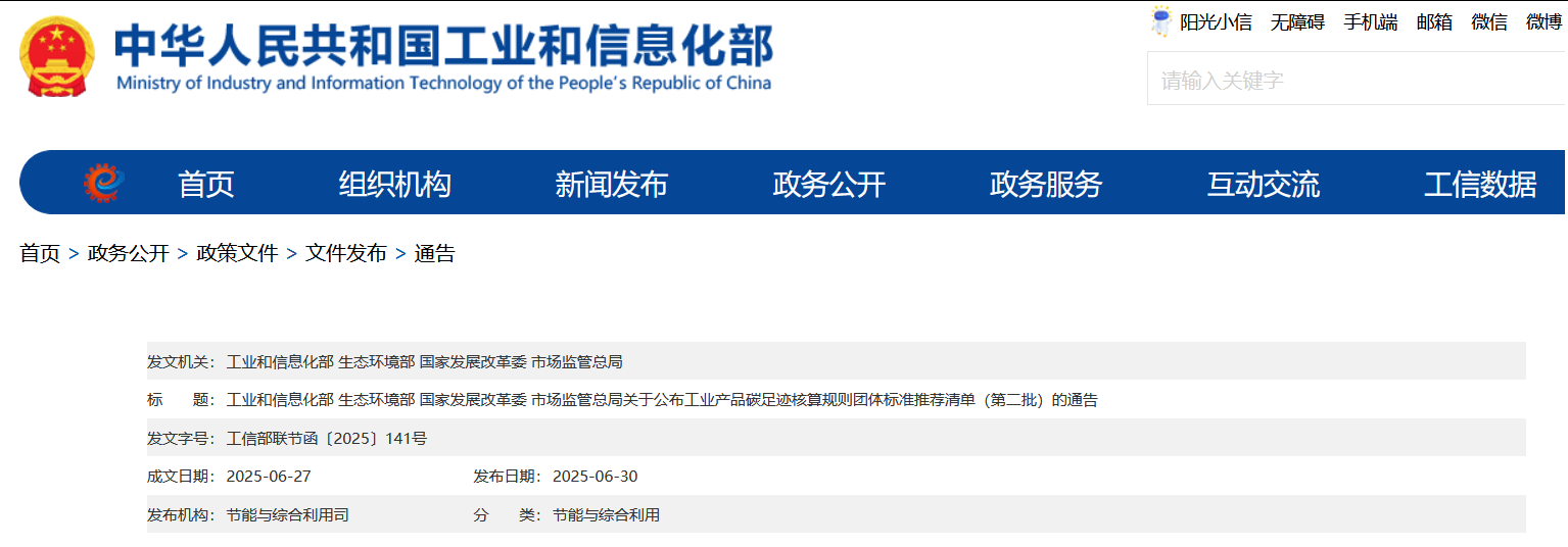 • 2025-08-06 工業(yè)和信息化部等四部門關于公布工業(yè)產品碳足跡核算規(guī)則團體標準推薦清單(第二批)的通告
